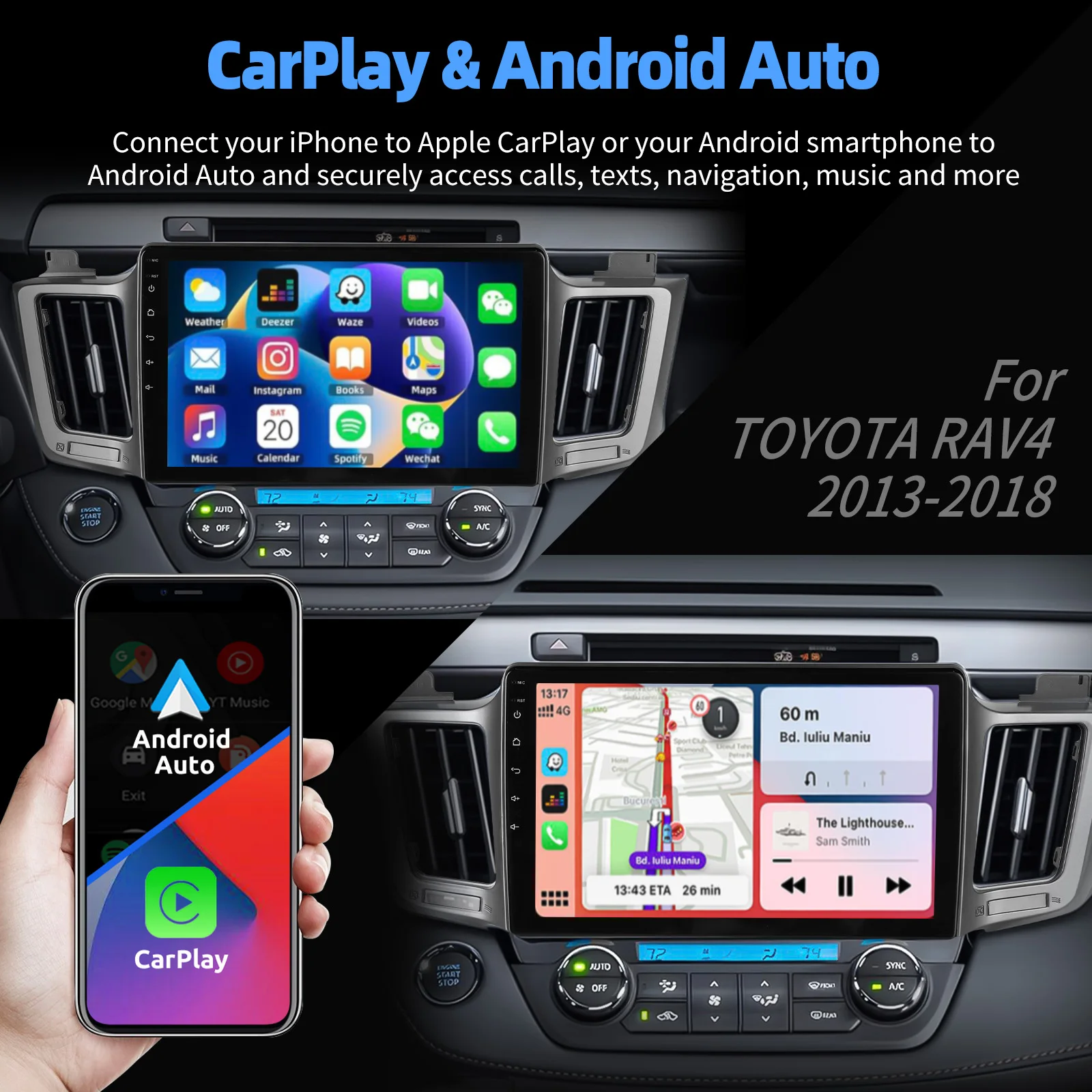 10.1 Inch Android 14 Car Radio For Toyota RAV4 2013-2018:The Android car radio with 10.1" 1280* 720 IPS capacitive touchscreen,4GB RAM and 64GB ROMallows you to download your favorite apps and videos, so driving is no longer boring. No extra frame, no cable change, plug and play.It comes with CANBUS decoder harness, support JBL sound system and most of the original functions
