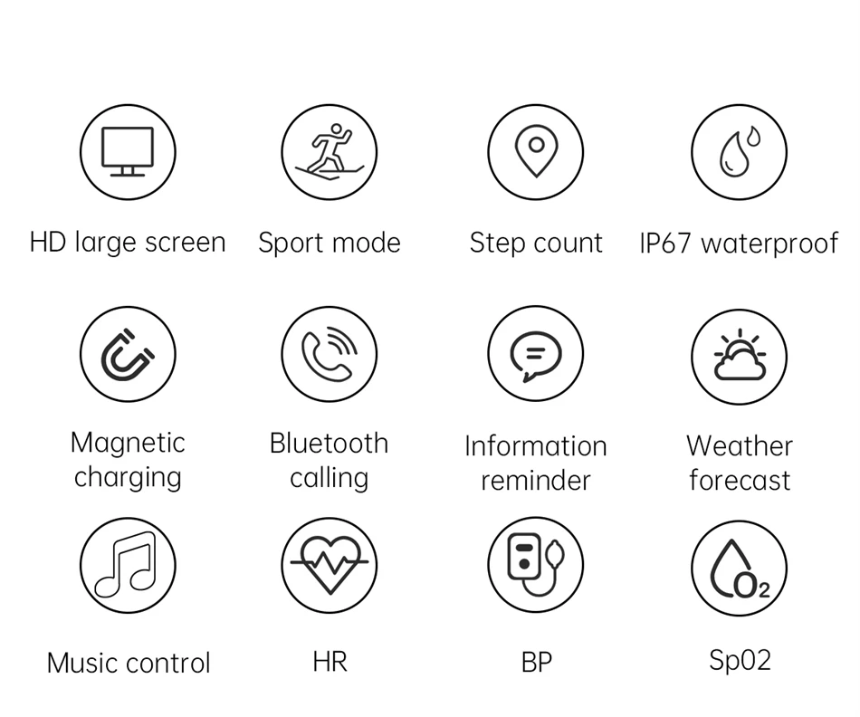 Receive/Reject phone calls/ Dial phone calls, Heart rate monitoring, Blood/Blood oxygen pressure monitoring, Sleep monitoring, Sedentary reminder, Sports pedometer/calorieconsumption/track record/exercise time, Call reminder and display, Message is pushed and displayed, Remote control camera, Automatically heart rate measurement, Multi-Sport measurement, Clock reminder, Alarm reminder, 4 kinds of dials default. APP customized watch faces are optional