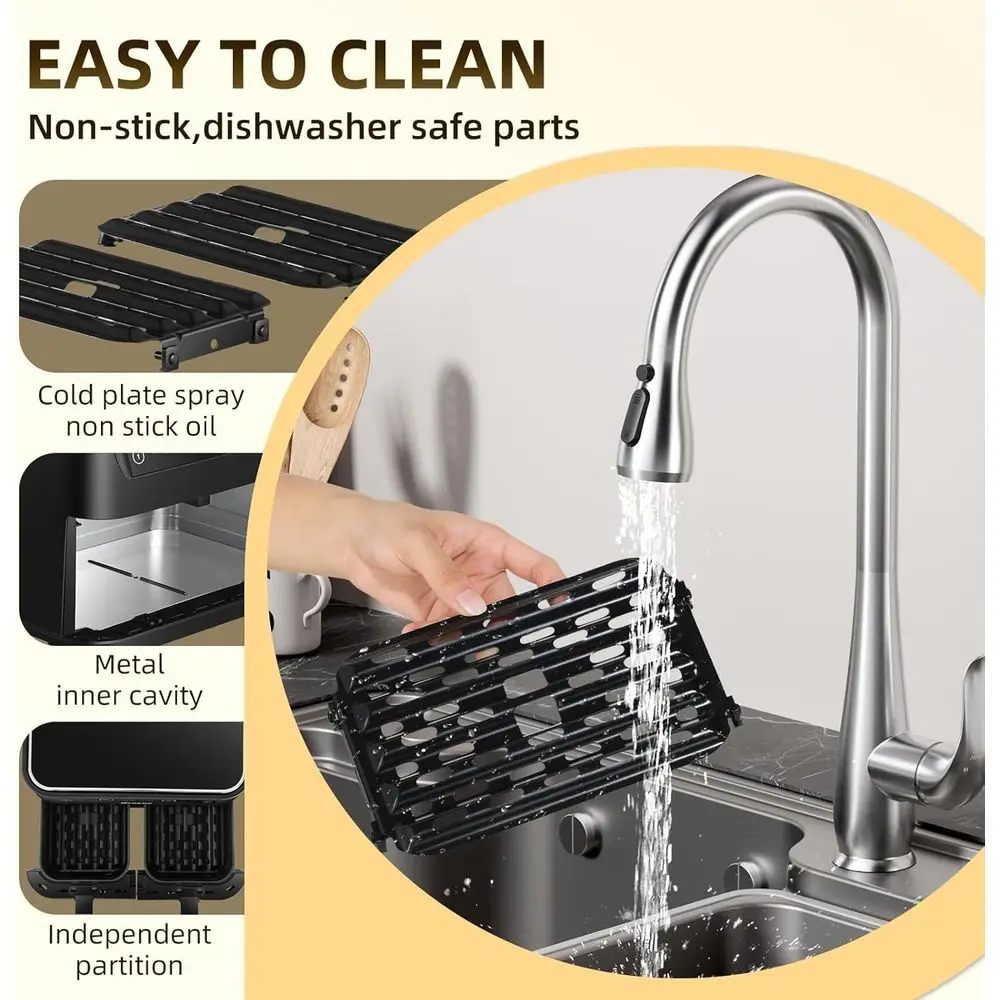 This dual-basket air fryer offers a total capacity of 8.5 quarts, with each basket holding 4.2 quarts, making it ideal for family-sized meals. The separate baskets enable you to cook two different dishes at the same time, conserving time and energy for other activities.