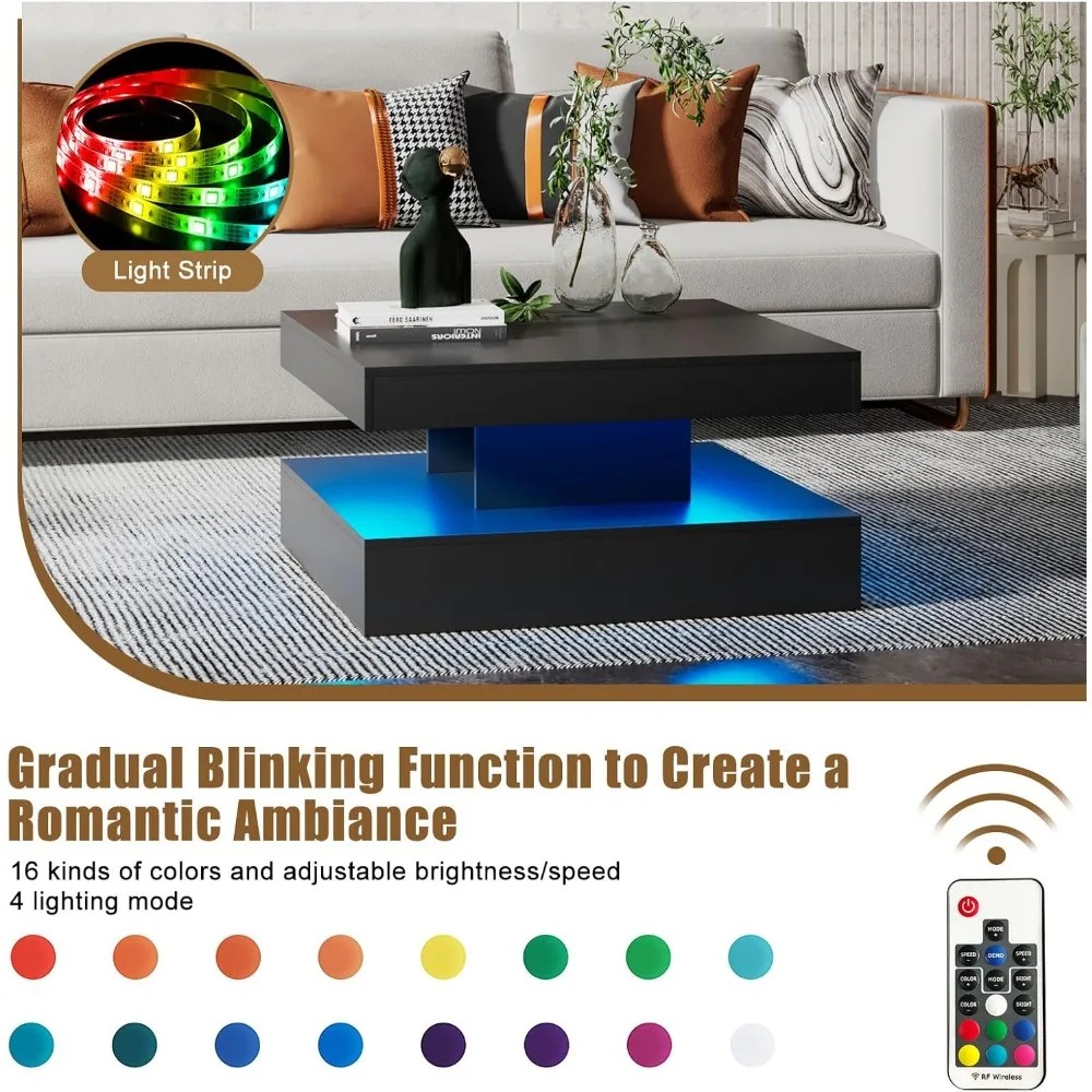 - 16 Colors Light LED Coffee Table for Living Room with 2 Tier Storage: This square storage modern coffee table comes with 16 colors variations and 4 light illumination modes, remote control on/off and adjustable brightness modes, creating a romantic and cheerful atmosphere that stands out from ordinary tables to make your life relax and exciting especially at night, perfect for parties and various scenarios for right mood and fun.