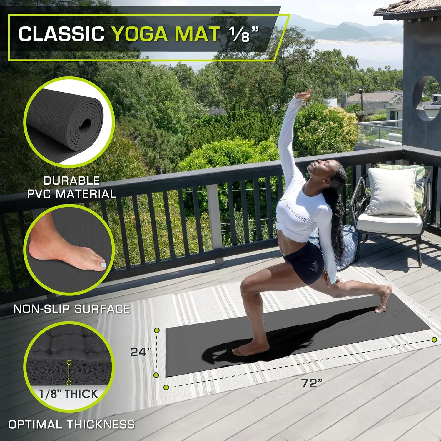 Discover the perfect yoga mat designed to enhance your fitness routine with superior comfort and stability. This premium mat offers exceptional features that cater to both beginners and experienced practitioners. Key Features: - Extra Long Design: Measuring 72 inches in length and 24 inches in width, this spacious mat provides ample room for tall users or those who prefer more space during their workouts. Its generous size ensures you can move freely without restrictions. - Optimal Thickness: At just 3mm (1/8 inch) thick, this mat strikes the ideal balance between cushioning and stability. It offers enough padding to protect your joints on hard surfaces while maintaining a firm grip for better balance during poses. - Non-Slip Surface: The textured surface provides excellent traction, preventing slips and ensuring a secure hold for both hands and feet. This feature makes challenging yoga poses easier to maintain, enhancing your overall practice safety. - Lightweight & Portable: Crafted from durable materials, this mat is easy to carry and transport. It rolls up compactly for convenient storage and travel to the gym, studio, park, or home use. - Easy Maintenance: Designed for hassle-free cleaning, simply wipe down with a damp cloth after use to keep it fresh and hygienic for your next session. - Safe Materials: Made from high-quality PVC that is free from harmful substances such as phthalates, dioxins, furans, or heavy metals. This ensures a safe and healthy environment for your workouts. Ideal For: This versatile fitness mat is suitable for various activities including yoga, Pilates, stretching exercises, meditation sessions at home or outdoors—making it an essential accessory for anyone committed to their wellness journey.