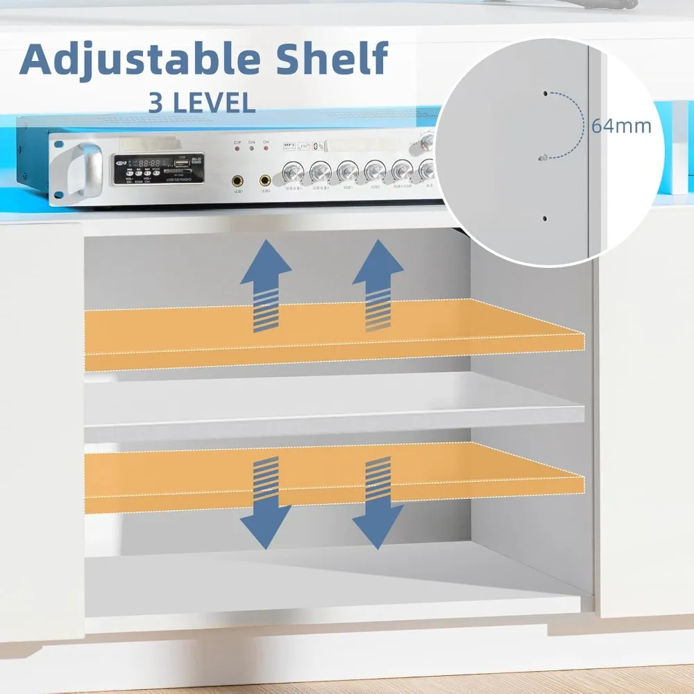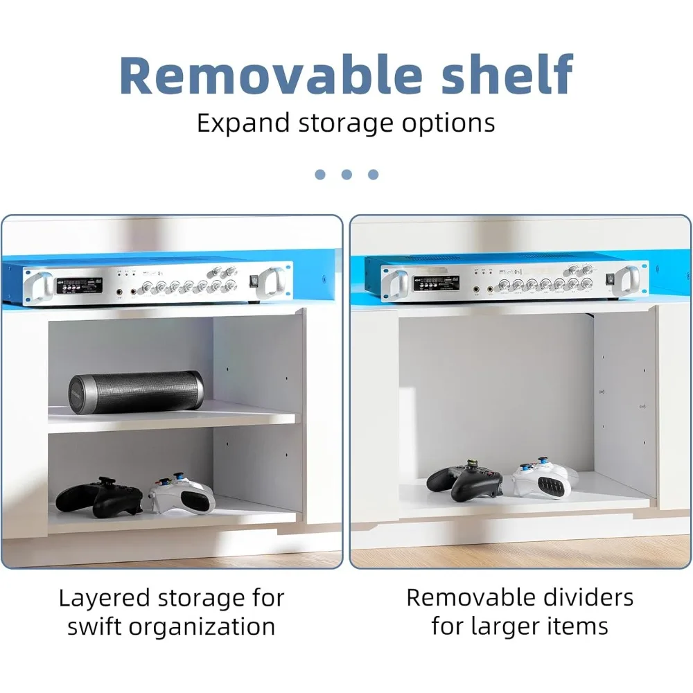 - 【Ambient Light】The LED white TV stand features LED Lights. Not confined to a little colors, You can pick hundreds of colors on the spectrum of APP as you like. Feel free to choose different twinkle frequency or brightness. Setting Music Mode, LED can even twinkle along with the rhythm