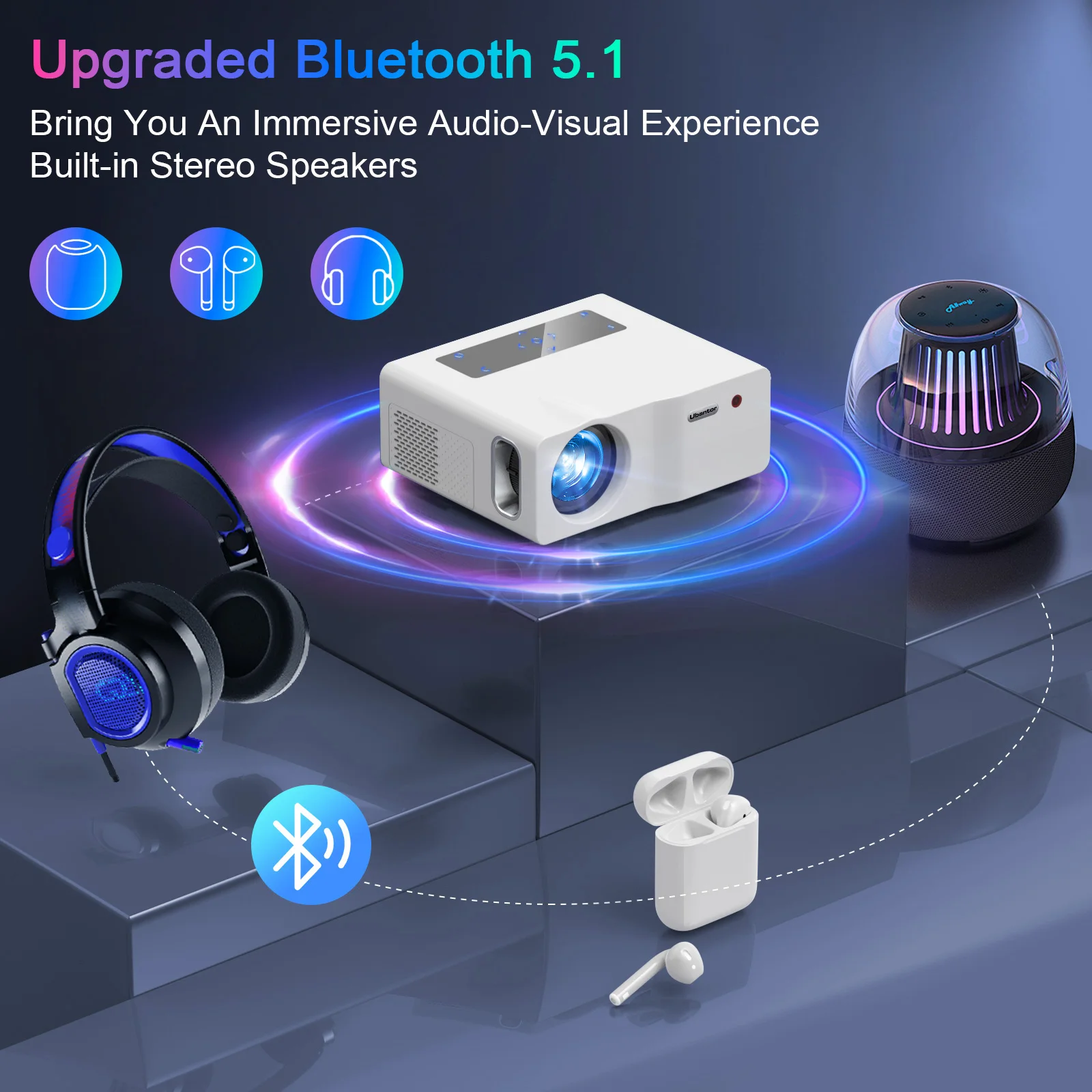 【2.4G/5G Dual Band Wifi & Bluetooth 5.0 Connection】The home video wifi projector adopt upgrade 2.4G/5G Dual-Band WiFi function, 5G wifi projector has a higher wireless speed, and a wider range. Avoid delay, realizing ultra-clear transmission. Bluetooth projector support Screen Mirroring/Airplay function, with advanced Bluetooth 5.1 chip, allowing you to connect to your Bluetooth speakers/headsets any time freely.