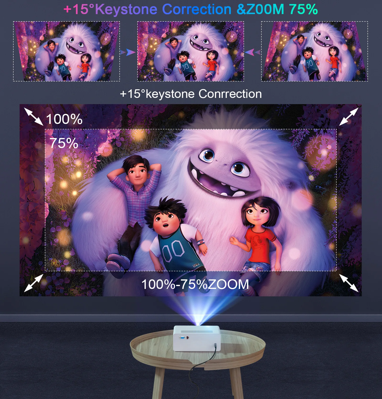 【450'' Giant Display & Zoom Function & Keystone Correction】This Bluetooth projector offers 50"-450"Giant Display, 4:3/16:9 aspect ratio. 75-100% Zoom function, and straight forward to achieve a clear and quality image by the focus and keystone ±15°correction adjusting, let you get the best viewing effect whether in home theater or an outdoor movie. It has a 360° inversion function to to project from the front/back/ceiling,also support wall/table/ceiling mount and tripod installation.