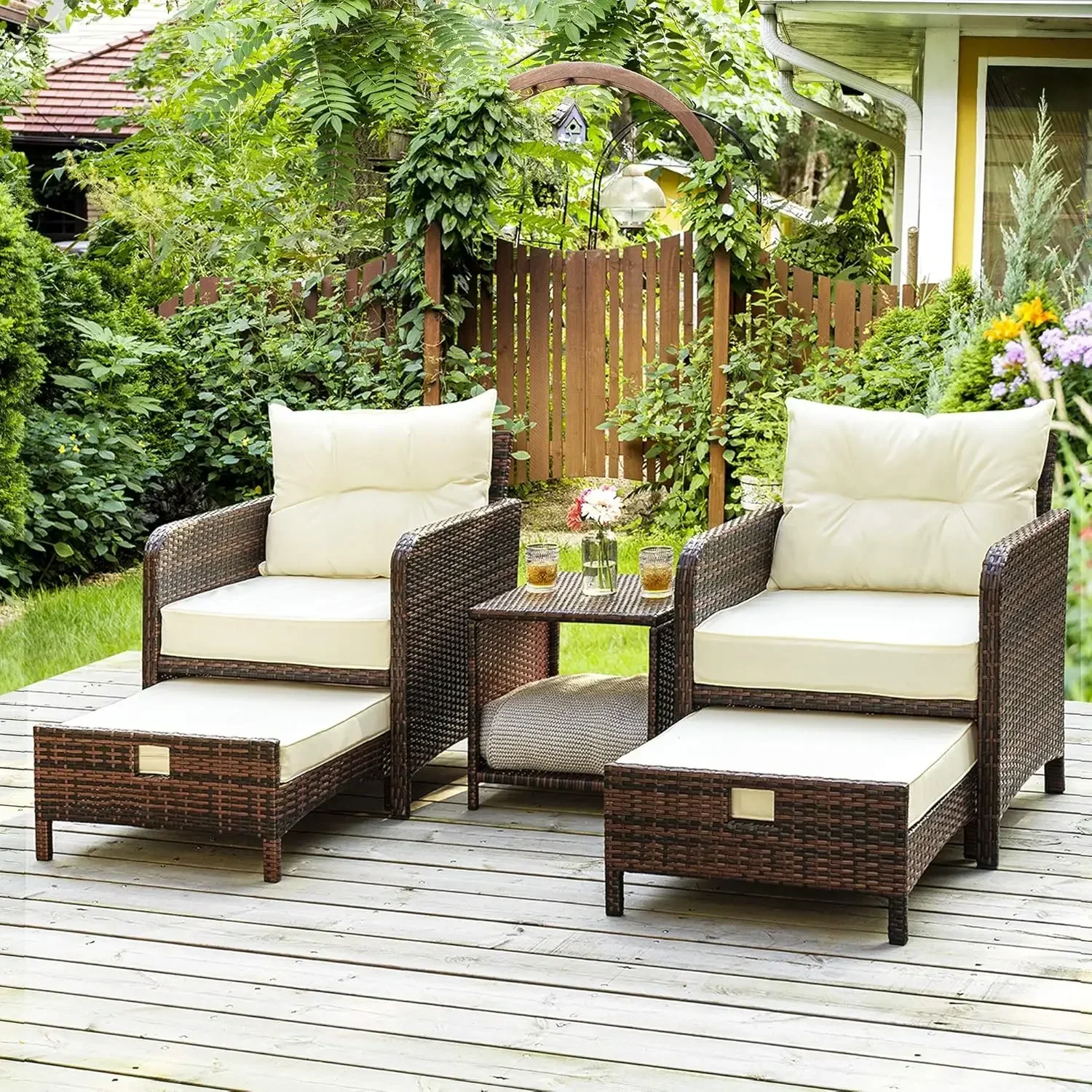 - Luxurious & Comfortable: PAMAPIC's 5-piece patio furniture set includes 2 single chairs, 2 ottomans and 1 coffee table. Each patio sofa can support up to 330 pounds. Large ottomans provide you with a comfortable place to rest