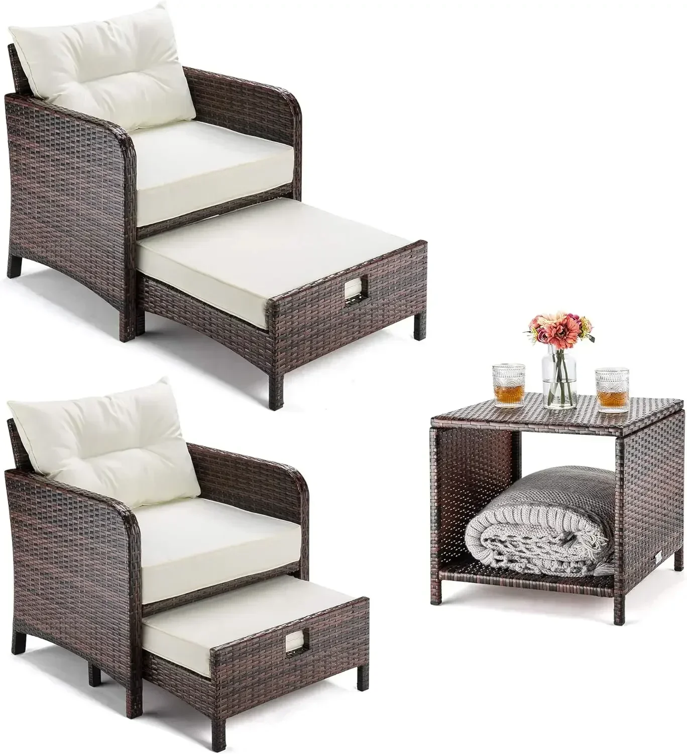 - Space Saving Design: The ottoman of our wicker patio conversation chairs set is cleverly designed to be tucked under the chair, maximizing space efficiency. By storing it under the chairs when not in use, you can greatly reduce the amount of space it takes up. If you're in need of a patio rattan furniture set that will save you valuable space, look no further than this 5-piece wicker furniture set