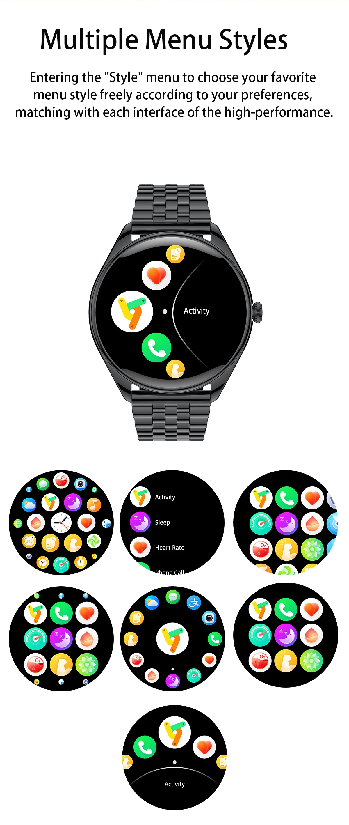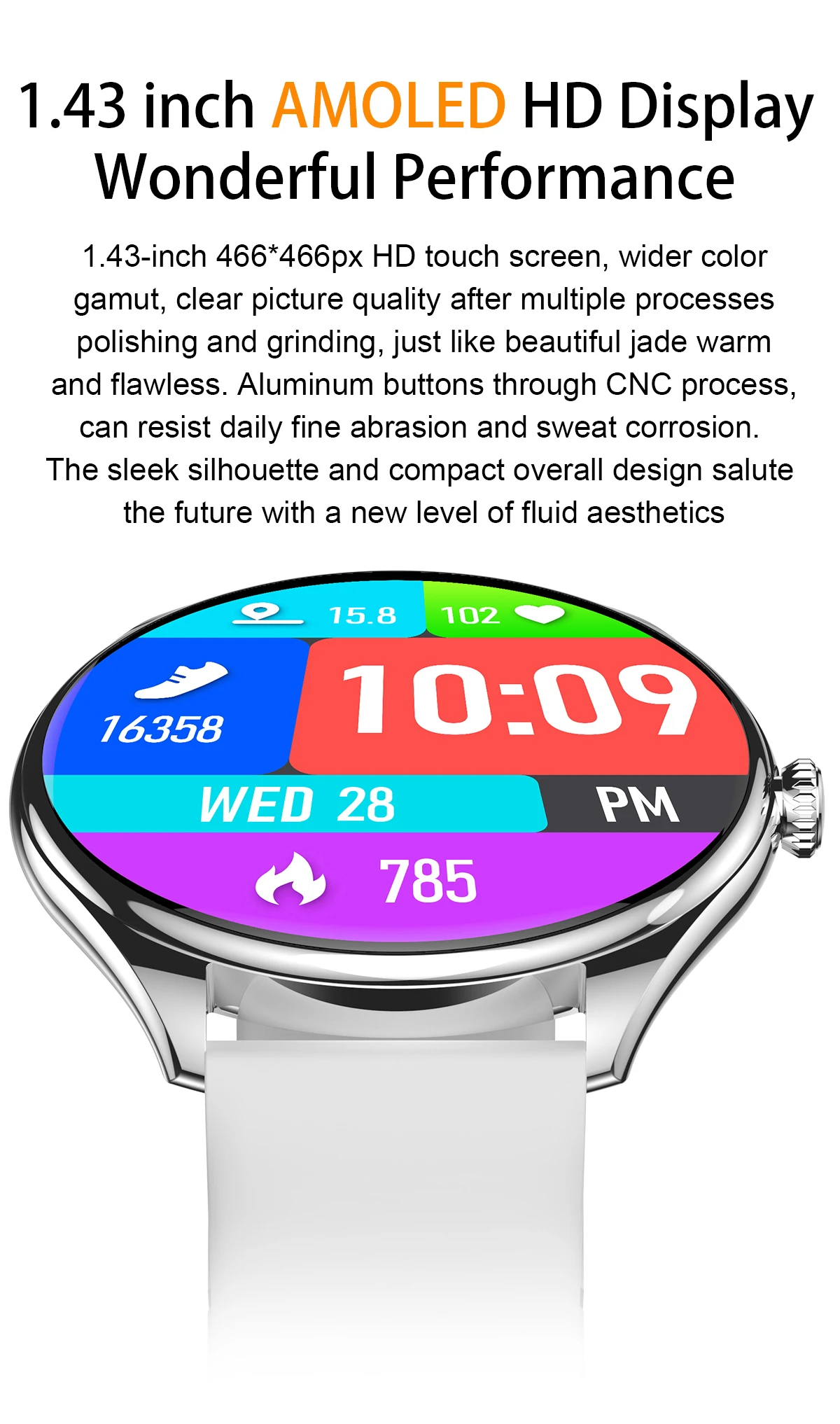 3.screen size:1.43 inch HD screen(AMOLED),466*466 enhanced high color gamut,Full touch screen + buttons.